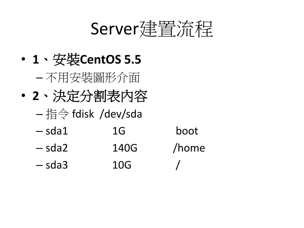 Server建置流程 • 1、安裝CentOS5.5 • 不用安裝圖形介面 • 2、決定分割表內容 • 指令 fdisk /dev/sda • sda1 1G boot • sda2 140G /home • sda3 10G /