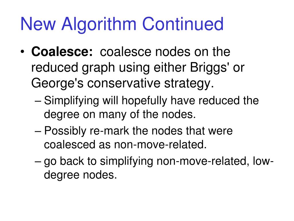 New Algorithm Continued • Coalesce: coalesce nodes on the reduced graph using either Briggs' or George's conservative strategy. • Simplifying will hopefully have reduced the degree on many of the nodes. • Possibly re-mark the nodes that were coalesced as non-move-related. • go back to simplifying non-move-related, low-degree nodes.