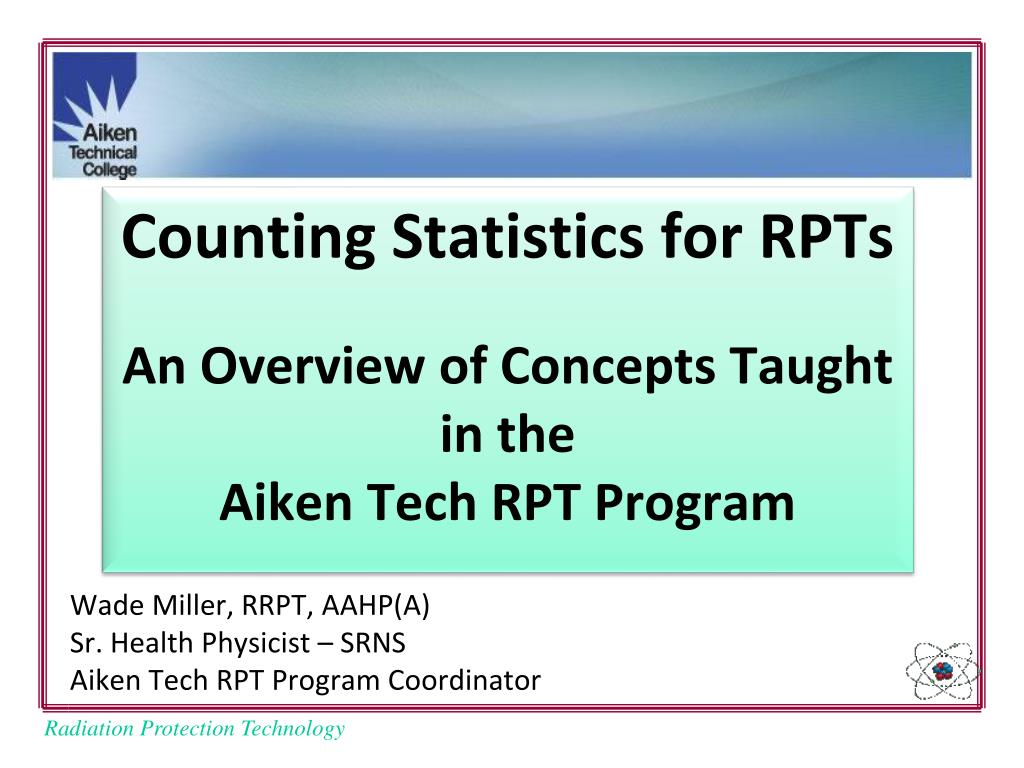 Counting Statistics for RPTs An Overview of Concepts Taught in the Aiken Tech RPT Program. Wade Miller, RRPT, AAHP(A) Sr. Health Physicist – SRNS Aiken Tech RPT Program Coordinator.