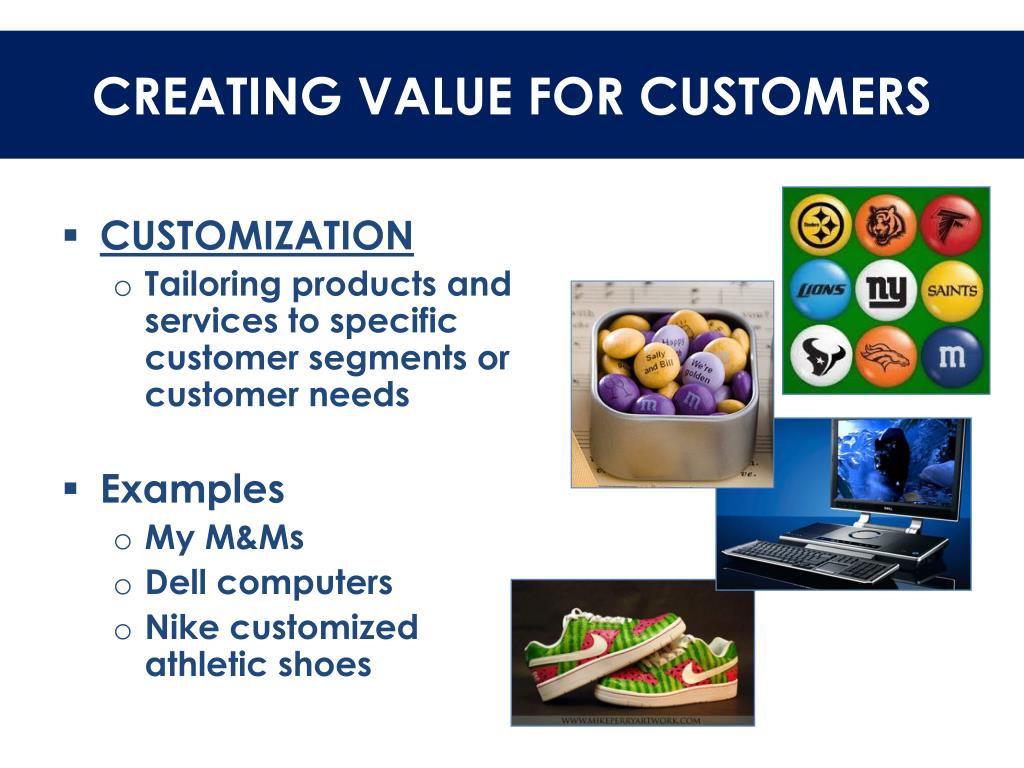CREATING VALUE FOR CUSTOMERS • CUSTOMIZATION • Tailoring products and services to specific customer segments or customer needs • Examples • My M&Ms • Dell computers • Nike customized athletic shoes