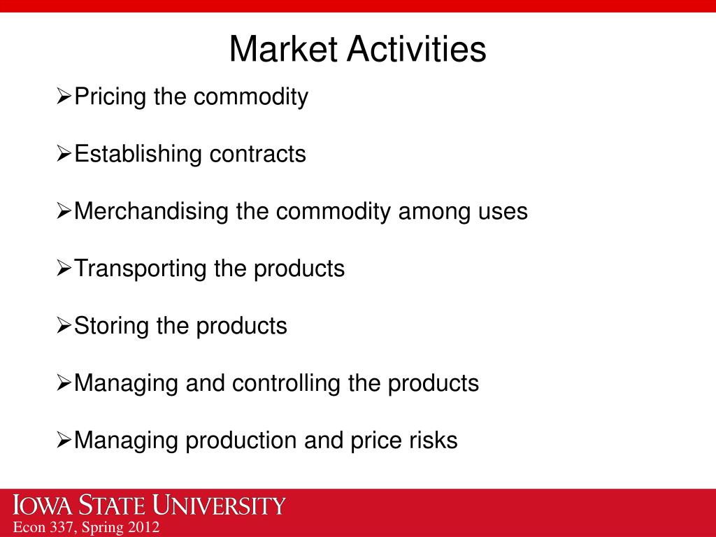 Market Activities • Pricing the commodity • Establishing contracts • Merchandising the commodity among uses • Transporting the products • Storing the products • Managing and controlling the products • Managing production and price risks