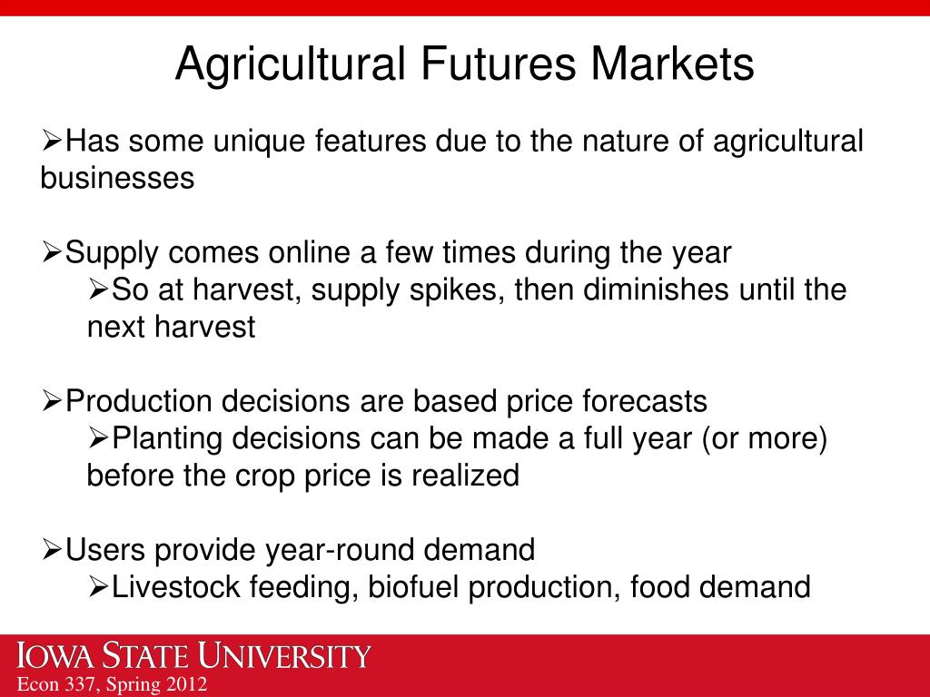 Agricultural Futures Markets • Has some unique features due to the nature of agricultural businesses • Supply comes online a few times during the year • So at harvest, supply spikes, then diminishes until the next harvest • Production decisions are based price forecasts • Planting decisions can be made a full year (or more) before the crop price is realized • Users provide year-round demand • Livestock feeding, biofuel production, food demand