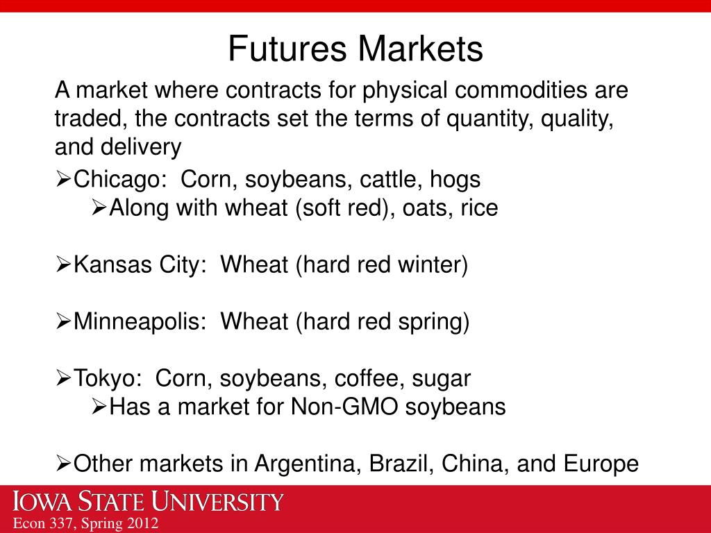 Futures Markets A market where contracts for physical commodities are traded, the contracts set the terms of quantity, quality, and delivery • Chicago: Corn, soybeans, cattle, hogs • Along with wheat (soft red), oats, rice • Kansas City: Wheat (hard red winter) • Minneapolis: Wheat (hard red spring) • Tokyo: Corn, soybeans, coffee, sugar • Has a market for Non-GMO soybeans • Other markets in Argentina, Brazil, China, and Europe