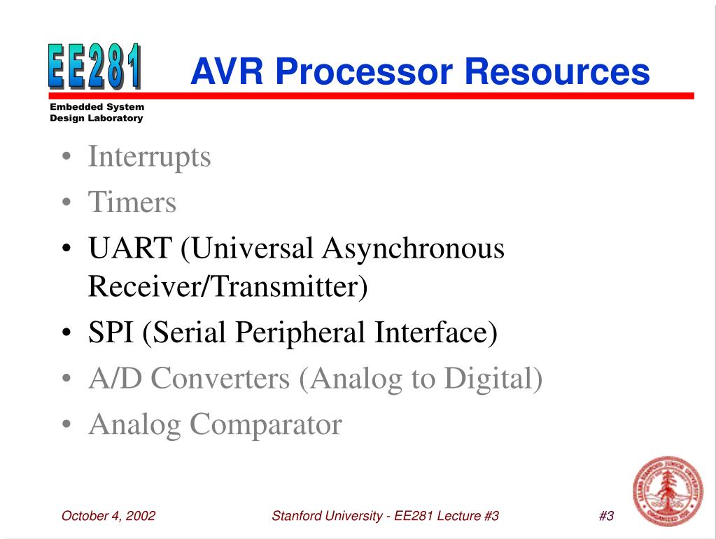 AVR Processor Resources • Interrupts • Timers • UART (Universal Asynchronous Receiver/Transmitter) • SPI (Serial Peripheral Interface) • A/D Converters (Analog to Digital) • Analog Comparator Stanford University - EE281 Lecture #3