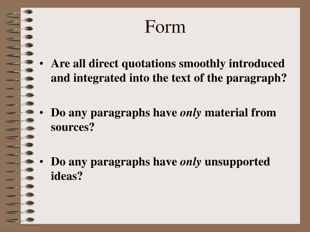 Form • Are all direct quotations smoothly introduced and integrated into the text of the paragraph? • Do any paragraphs have only material from sources? • Do any paragraphs have only unsupported ideas?