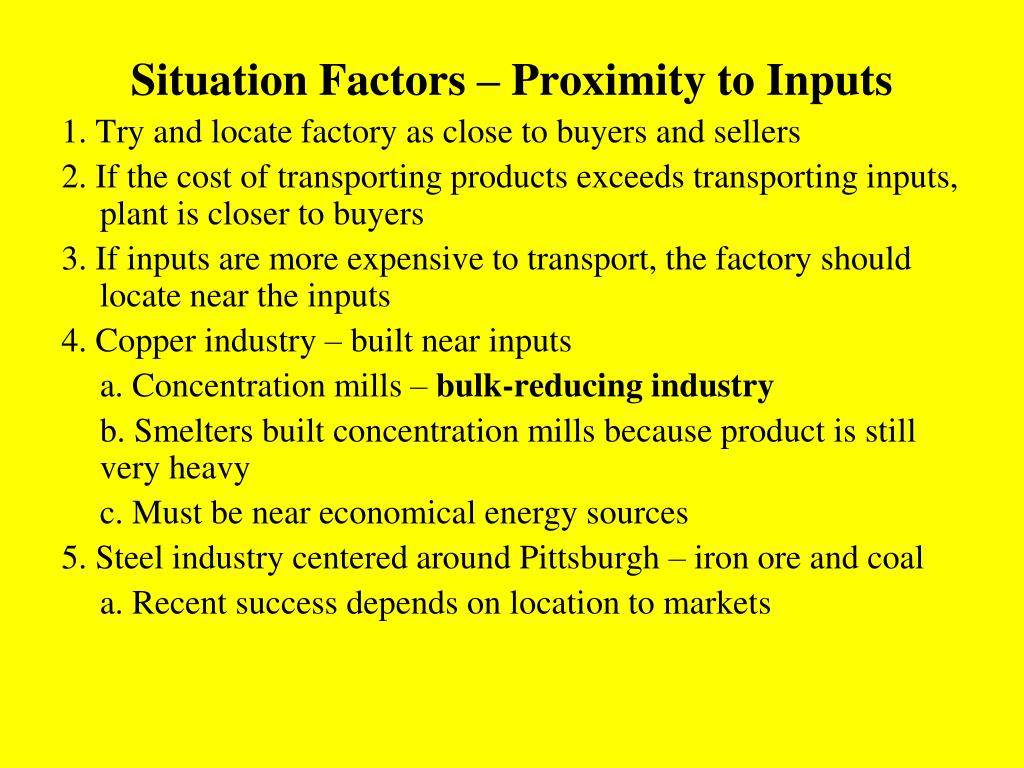 Situation Factors – Proximity to Inputs 1. Try and locate factory as close to buyers and sellers 2. If the cost of transporting products exceeds transporting inputs, plant is closer to buyers 3. If inputs are more expensive to transport, the factory should locate near the inputs 4. Copper industry – built near inputs a. Concentration mills – bulk-reducing industry b. Smelters built concentration mills because product is still very heavy c. Must be near economical energy sources 5. Steel industry centered around Pittsburgh – iron ore and coal a. Recent success depends on location to markets
