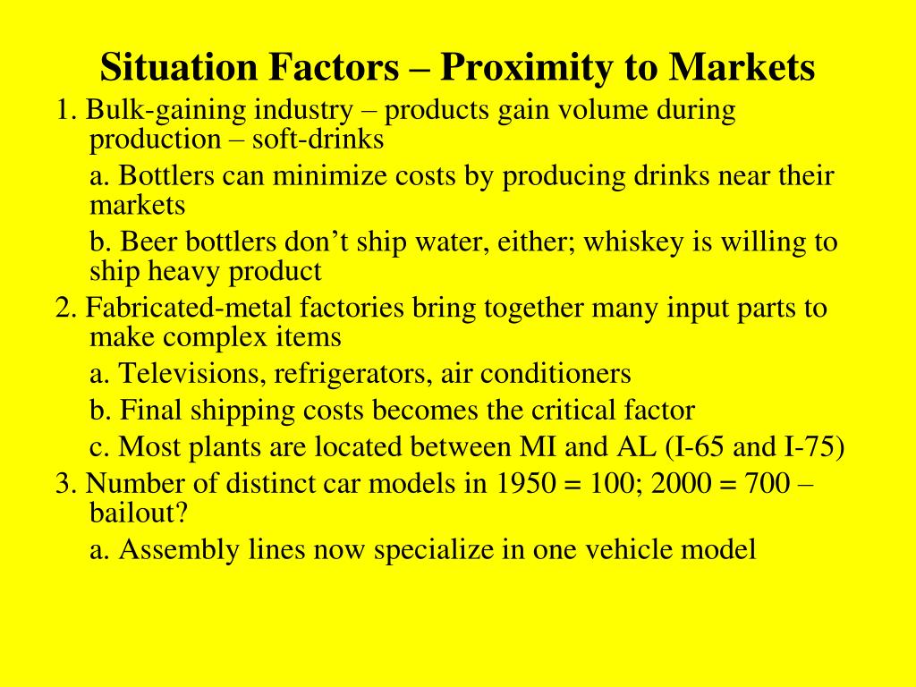 Situation Factors – Proximity to Markets 1. Bulk-gaining industry – products gain volume during production – soft-drinks a. Bottlers can minimize costs by producing drinks near their markets b. Beer bottlers don’t ship water, either; whiskey is willing to ship heavy product 2. Fabricated-metal factories bring together many input parts to make complex items a. Televisions, refrigerators, air conditioners b. Final shipping costs becomes the critical factor c. Most plants are located between MI and AL (I-65 and I-75) 3. Number of distinct car models in 1950 = 100; 2000 = 700 – bailout? a. Assembly lines now specialize in one vehicle model