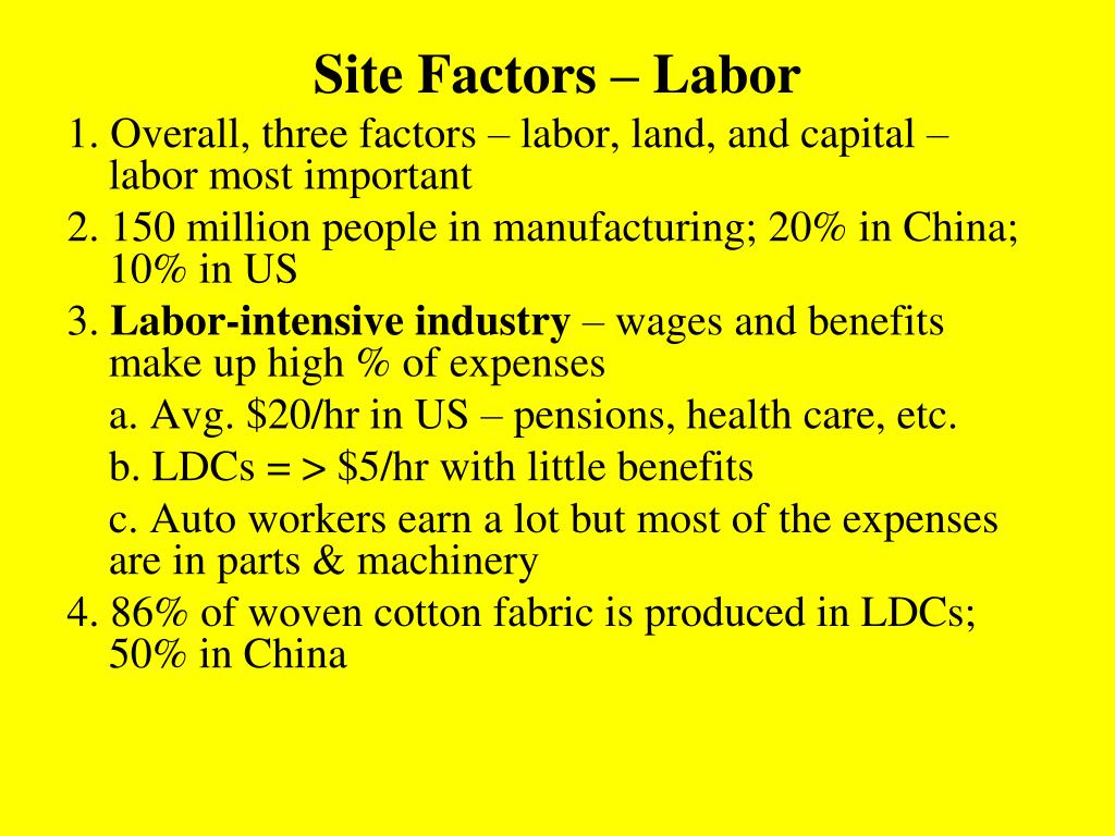 Site Factors – Labor 1. Overall, three factors – labor, land, and capital – labor most important 2. 150 million people in manufacturing; 20% in China; 10% in US 3. Labor-intensive industry – wages and benefits make up high % of expenses a. Avg. $20/hr in US – pensions, health care, etc. b. LDCs = > $5/hr with little benefits c. Auto workers earn a lot but most of the expenses are in parts & machinery 4. 86% of woven cotton fabric is produced in LDCs; 50% in China