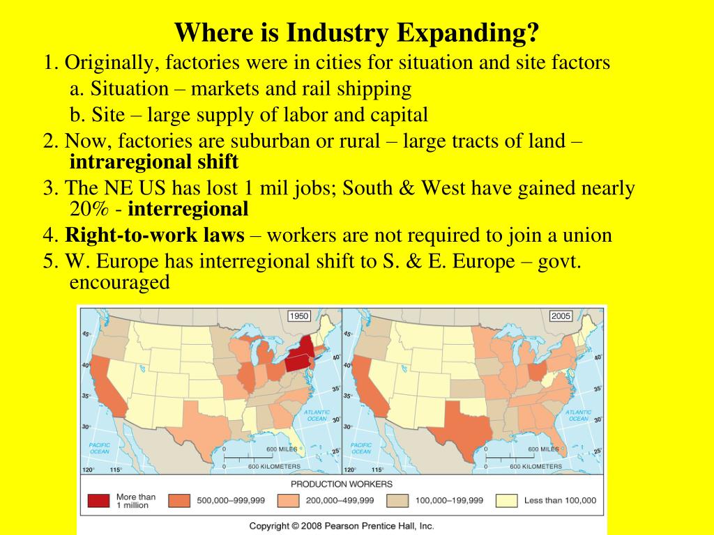 Where is Industry Expanding? 1. Originally, factories were in cities for situation and site factors a. Situation – markets and rail shipping b. Site – large supply of labor and capital 2. Now, factories are suburban or rural – large tracts of land – intraregional shift 3. The NE US has lost 1 mil jobs; South & West have gained nearly 20% - interregional 4. Right-to-work laws – workers are not required to join a union 5. W. Europe has interregional shift to S. & E. Europe – govt. encouraged