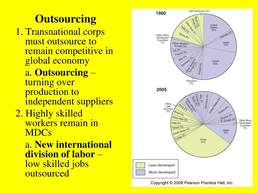 Outsourcing 1. Transnational corps must outsource to remain competitive in global economy a. Outsourcing – turning over production to independent suppliers 2. Highly skilled workers remain in MDCs a. New international division of labor – low skilled jobs outsourced
