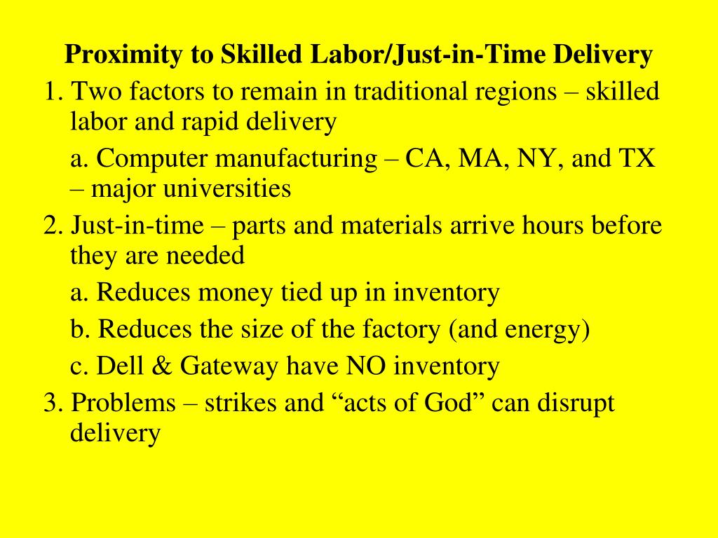 Proximity to Skilled Labor/Just-in-Time Delivery 1. Two factors to remain in traditional regions – skilled labor and rapid delivery a. Computer manufacturing – CA, MA, NY, and TX – major universities 2. Just-in-time – parts and materials arrive hours before they are needed a. Reduces money tied up in inventory b. Reduces the size of the factory (and energy) c. Dell & Gateway have NO inventory 3. Problems – strikes and “acts of God” can disrupt delivery