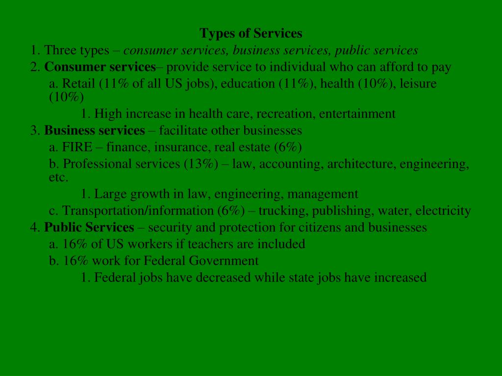 Types of Services 1. Three types – consumer services, business services, public services 2. Consumer services– provide service to individual who can afford to pay a. Retail (11% of all US jobs), education (11%), health (10%), leisure (10%) 1. High increase in health care, recreation, entertainment 3. Business services – facilitate other businesses a. FIRE – finance, insurance, real estate (6%) b. Professional services (13%) – law, accounting, architecture, engineering, etc. 1. Large growth in law, engineering, management c. Transportation/information (6%) – trucking, publishing, water, electricity 4. Public Services – security and protection for citizens and businesses a. 16% of US workers if teachers are included b. 16% work for Federal Government 1. Federal jobs have decreased while state jobs have increased