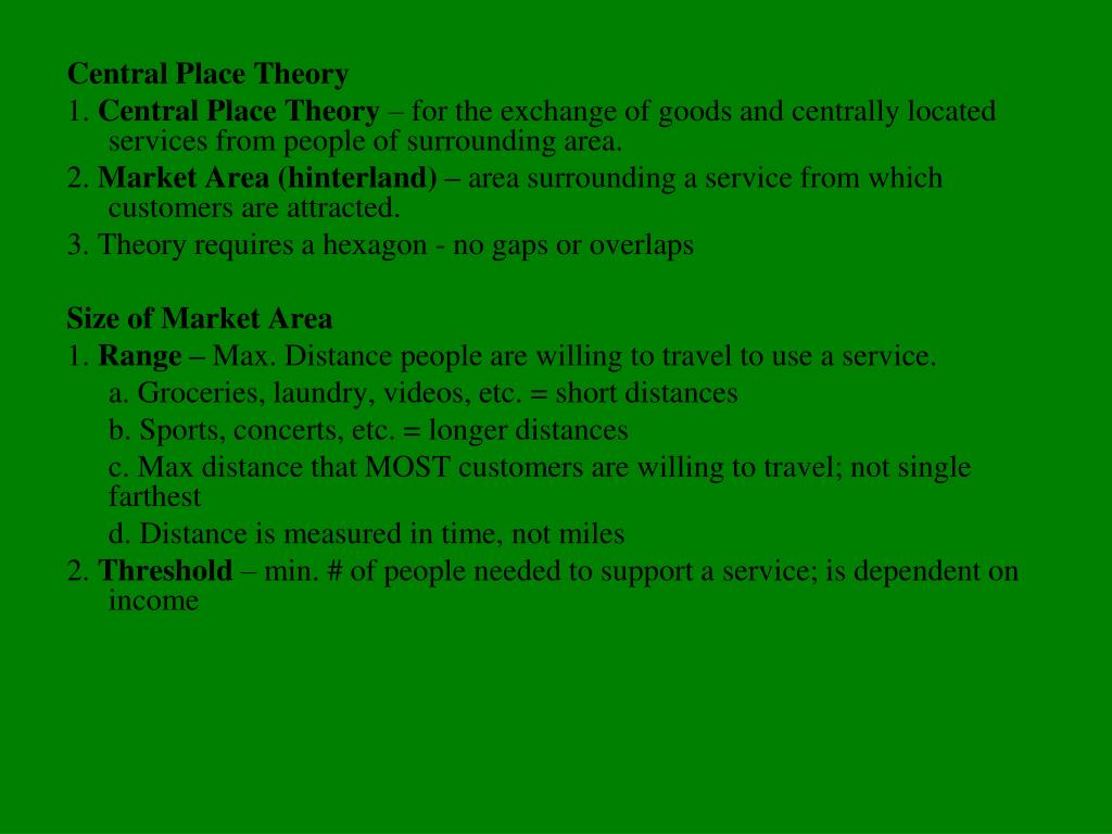 Central Place Theory 1. Central Place Theory – for the exchange of goods and centrally located services from people of surrounding area. 2. Market Area (hinterland) – area surrounding a service from which customers are attracted. 3. Theory requires a hexagon - no gaps or overlaps Size of Market Area 1. Range – Max. Distance people are willing to travel to use a service. a. Groceries, laundry, videos, etc. = short distances b. Sports, concerts, etc. = longer distances c. Max distance that MOST customers are willing to travel; not single farthest d. Distance is measured in time, not miles 2. Threshold – min. # of people needed to support a service; is dependent on income