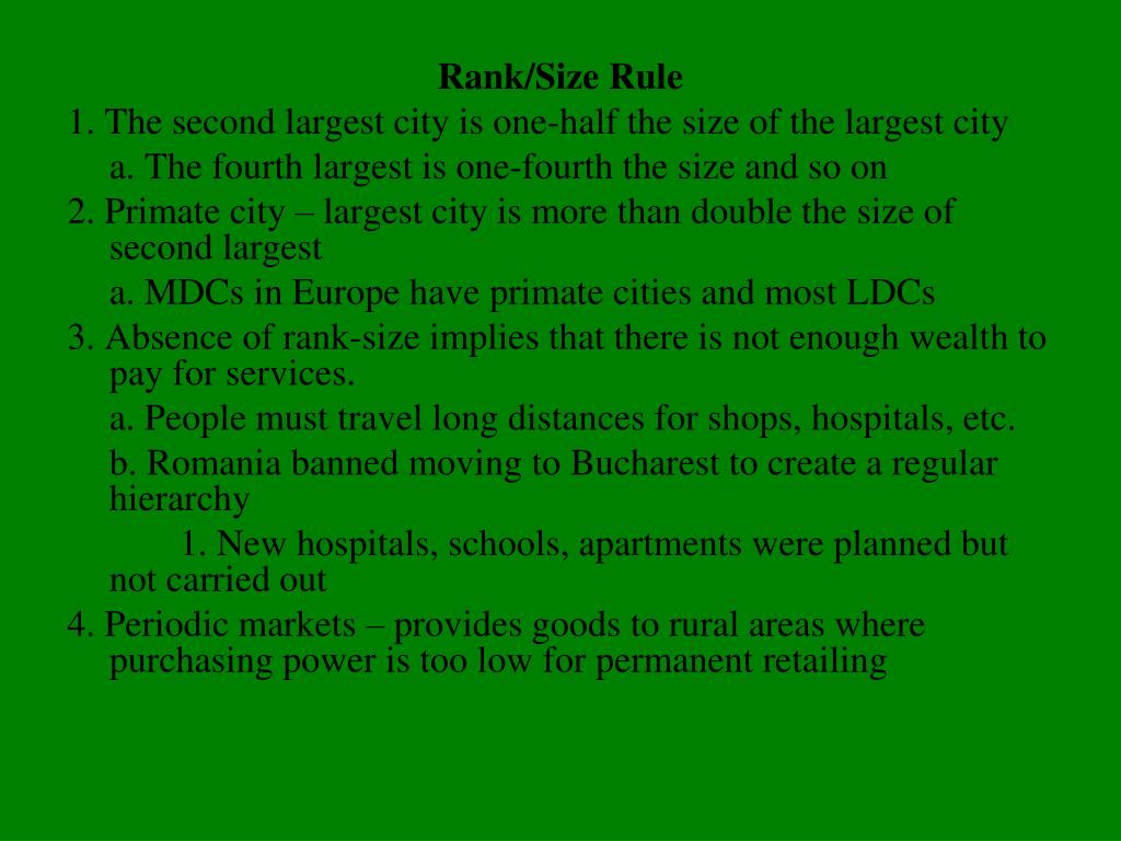 Rank/Size Rule 1. The second largest city is one-half the size of the largest city a. The fourth largest is one-fourth the size and so on 2. Primate city – largest city is more than double the size of second largest a. MDCs in Europe have primate cities and most LDCs 3. Absence of rank-size implies that there is not enough wealth to pay for services. a. People must travel long distances for shops, hospitals, etc. b. Romania banned moving to Bucharest to create a regular hierarchy 1. New hospitals, schools, apartments were planned but not carried out 4. Periodic markets – provides goods to rural areas where purchasing power is too low for permanent retailing
