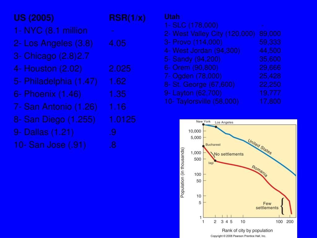 Utah 1- SLC (178,000) - 2- West Valley City (120,000) 89,000 3- Provo (114,000) 59,333 4- West Jordan (94,300) 44,500 5- Sandy (94,200) 35,600 6- Orem (90,800) 29,666 7- Ogden (78,000) 25,428 8- St. George (67,600) 22,250 9- Layton (62,700) 19,777 10- Taylorsville (58,000) 17,800 US (2005) RSR(1/x) 1- NYC (8.1 million - 2- Los Angeles (3.8) 4.05 3- Chicago (2.8) 2.7 4- Houston (2.02) 2.025 5- Philadelphia (1.47) 1.62 6- Phoenix (1.46) 1.35 7- San Antonio (1.26) 1.16 8- San Diego (1.255) 1.0125 9- Dallas (1.21) .9 10- San Jose (.91) .8