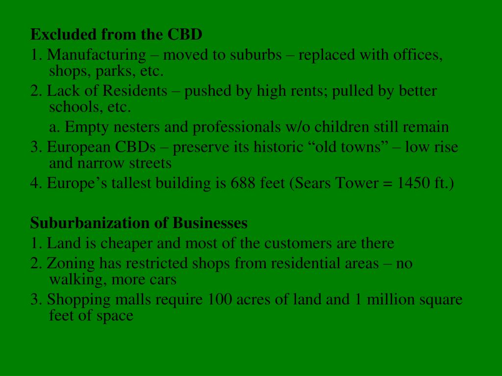 Excluded from the CBD 1. Manufacturing – moved to suburbs – replaced with offices, shops, parks, etc. 2. Lack of Residents – pushed by high rents; pulled by better schools, etc. a. Empty nesters and professionals w/o children still remain 3. European CBDs – preserve its historic “old towns” – low rise and narrow streets 4. Europe’s tallest building is 688 feet (Sears Tower = 1450 ft.) Suburbanization of Businesses 1. Land is cheaper and most of the customers are there 2. Zoning has restricted shops from residential areas – no walking, more cars 3. Shopping malls require 100 acres of land and 1 million square feet of space