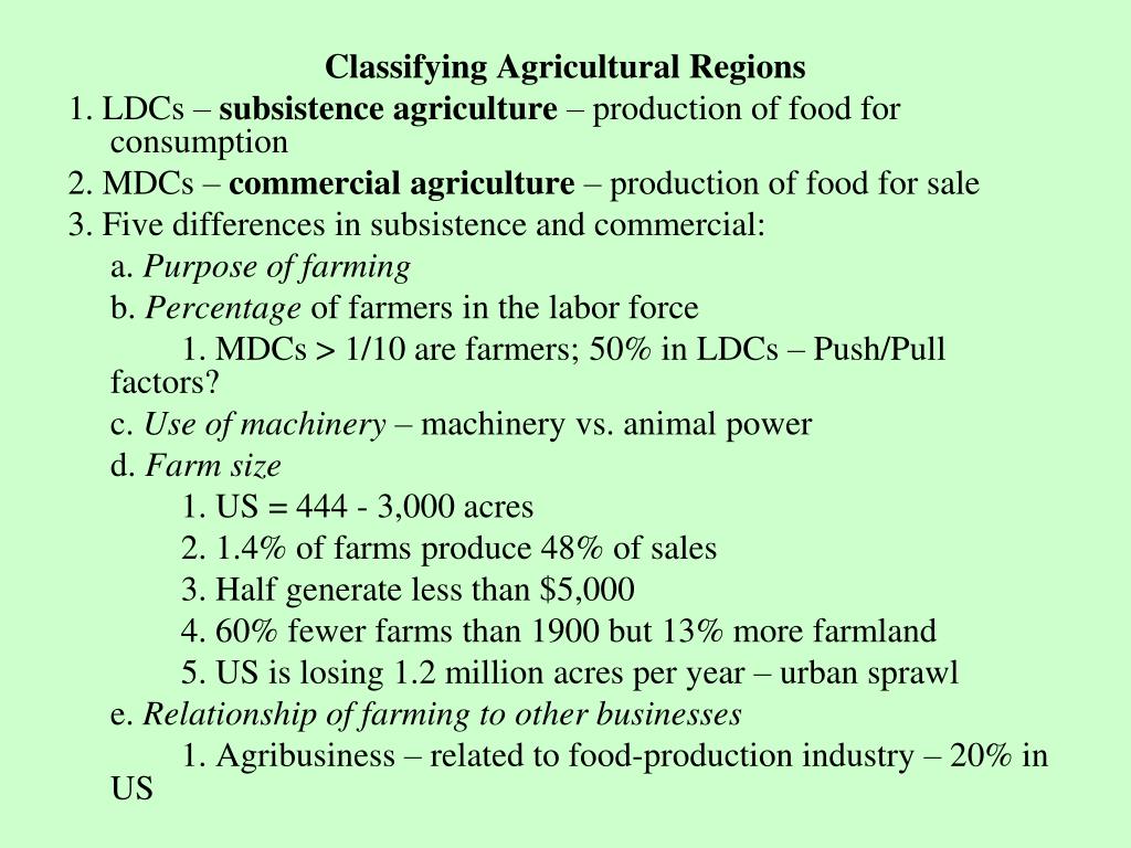 Classifying Agricultural Regions 1. LDCs – subsistence agriculture – production of food for consumption 2. MDCs – commercial agriculture – production of food for sale 3. Five differences in subsistence and commercial: a. Purpose of farming b. Percentage of farmers in the labor force 1. MDCs > 1/10 are farmers; 50% in LDCs – Push/Pull factors? c. Use of machinery – machinery vs. animal power d. Farm size 1. US = 444 - 3,000 acres 2. 1.4% of farms produce 48% of sales 3. Half generate less than $5,000 4. 60% fewer farms than 1900 but 13% more farmland 5. US is losing 1.2 million acres per year – urban sprawl e. Relationship of farming to other businesses 1. Agribusiness – related to food-production industry – 20% in US