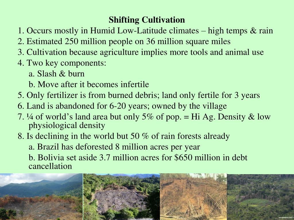 Shifting Cultivation 1. Occurs mostly in Humid Low-Latitude climates – high temps & rain 2. Estimated 250 million people on 36 million square miles 3. Cultivation because agriculture implies more tools and animal use 4. Two key components: a. Slash & burn b. Move after it becomes infertile 5. Only fertilizer is from burned debris; land only fertile for 3 years 6. Land is abandoned for 6-20 years; owned by the village 7. ¼ of world’s land area but only 5% of pop. = Hi Ag. Density & low physiological density 8. Is declining in the world but 50 % of rain forests already a. Brazil has deforested 8 million acres per year b. Bolivia set aside 3.7 million acres for $650 million in debt cancellation