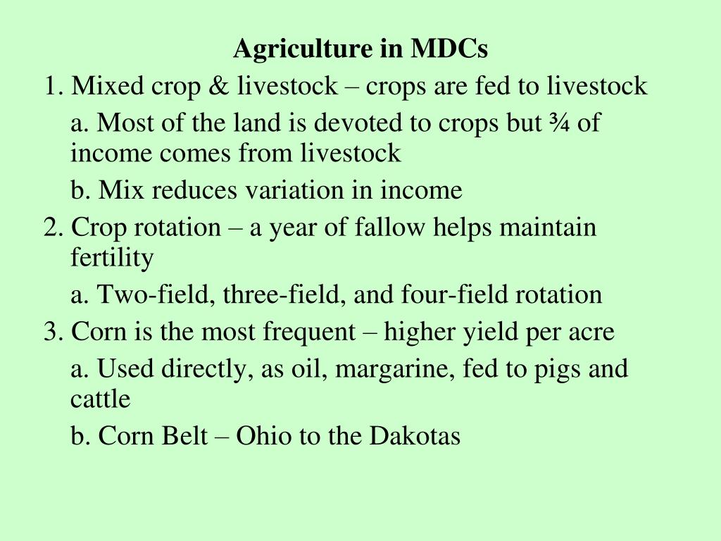 Agriculture in MDCs 1. Mixed crop & livestock – crops are fed to livestock a. Most of the land is devoted to crops but ¾ of income comes from livestock b. Mix reduces variation in income 2. Crop rotation – a year of fallow helps maintain fertility a. Two-field, three-field, and four-field rotation 3. Corn is the most frequent – higher yield per acre a. Used directly, as oil, margarine, fed to pigs and cattle b. Corn Belt – Ohio to the Dakotas