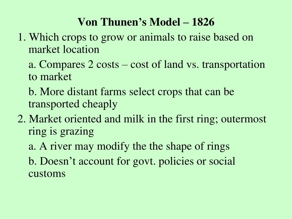 Von Thunen’s Model – 1826 1. Which crops to grow or animals to raise based on market location a. Compares 2 costs – cost of land vs. transportation to market b. More distant farms select crops that can be transported cheaply 2. Market oriented and milk in the first ring; outermost ring is grazing a. A river may modify the the shape of rings b. Doesn’t account for govt. policies or social customs