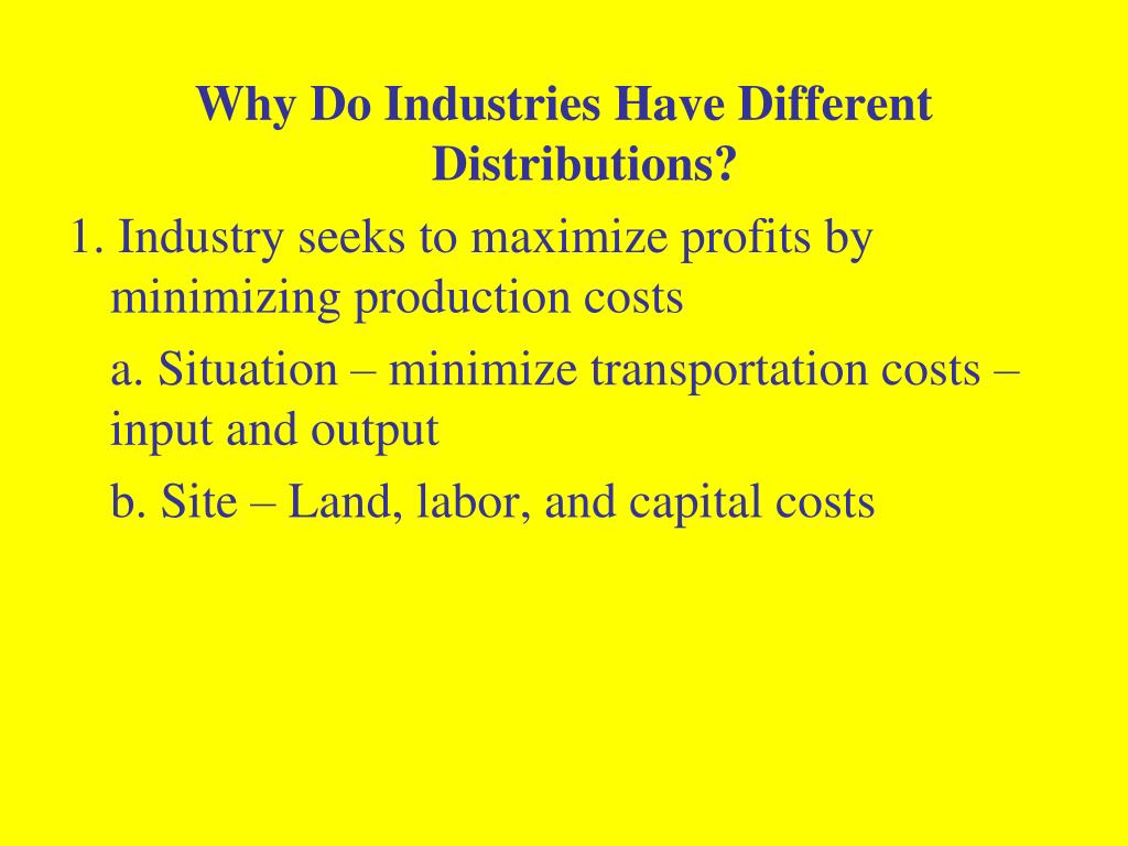 Why Do Industries Have Different Distributions? 1. Industry seeks to maximize profits by minimizing production costs a. Situation – minimize transportation costs – input and output b. Site – Land, labor, and capital costs