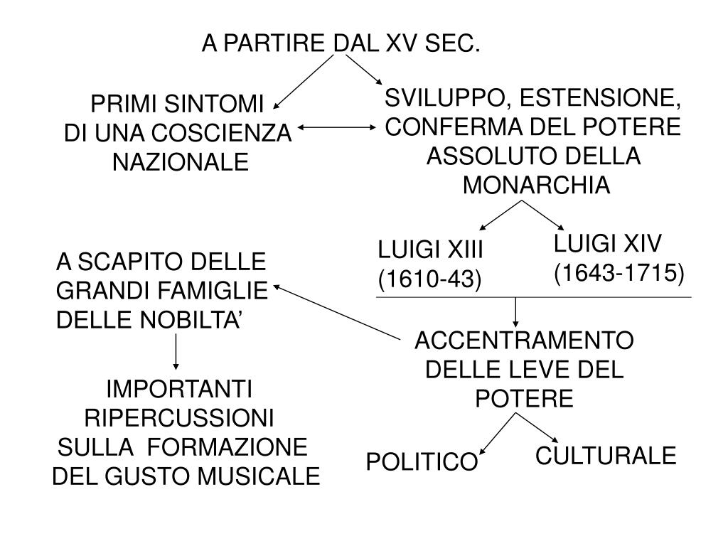 A PARTIRE DAL XV SEC. SVILUPPO, ESTENSIONE, CONFERMA DEL POTERE ASSOLUTO DELLA MONARCHIA PRIMI SINTOMI DI UNA COSCIENZA NAZIONALE LUIGI XIV (1643-1715) LUIGI XIII (1610-43) A SCAPITO DELLE GRANDI FAMIGLIE DELLE NOBILTA’ ACCENTRAMENTO DELLE LEVE DEL POTERE IMPORTANTI RIPERCUSSIONI SULLA FORMAZIONE DEL GUSTO MUSICALE CULTURALE POLITICO