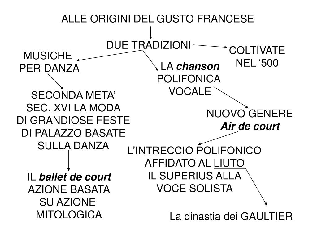 ALLE ORIGINI DEL GUSTO FRANCESE DUE TRADIZIONI COLTIVATE NEL ‘500 MUSICHE PER DANZA LA chanson POLIFONICA VOCALE SECONDA META’ SEC. XVI LA MODA DI GRANDIOSE FESTE DI PALAZZO BASATE SULLA DANZA NUOVO GENERE Air de court L’INTRECCIO POLIFONICO AFFIDATO AL LIUTO IL SUPERIUS ALLA VOCE SOLISTA IL ballet de court AZIONE BASATA SU AZIONE MITOLOGICA La dinastia dei GAULTIER