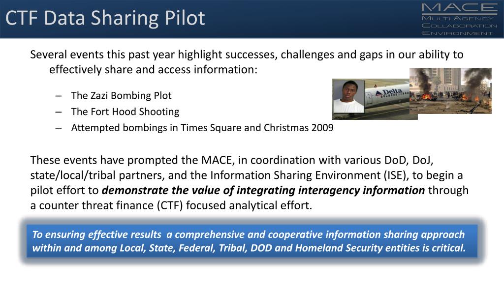 CTF Data Sharing Pilot Several events this past year highlight successes, challenges and gaps in our ability to effectively share and access information: • The Zazi Bombing Plot • The Fort Hood Shooting • Attempted bombings in Times Square and Christmas 2009 These events have prompted the MACE, in coordination with various DoD, DoJ, state/local/tribal partners, and the Information Sharing Environment (ISE), to begin a pilot effort to demonstrate the value of integrating interagency information through a counter threat finance (CTF) focused analytical effort. • To ensuring effective results a comprehensive and cooperative information sharing approach within and among Local, State, Federal, Tribal, DOD and Homeland Security entities is critical.