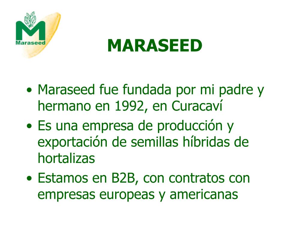 MARASEED • Maraseed fue fundada por mi padre y hermano en 1992, en Curacaví • Es una empresa de producción y exportación de semillas híbridas de hortalizas • Estamos en B2B, con contratos con empresas europeas y americanas