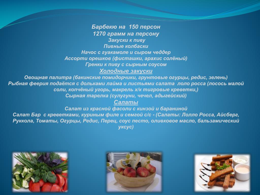 Барбекю на 150 персон 1270 грамм на персону Закуски к пиву Пивные колбаски Начос с гуакамоле и сыром чеддер Ассорти орешков (фисташки, арахис солёный) Гренки к пиву с сырным соусом Холодные закуски Овощная палитра (бакинские помидорчики, грунтовые огурцы, редис, зелень) Рыбная феерия подаётся с дольками лайма и листьями салата лоло росса (лосось малой соли, копчёный угорь, макрель х/к тигровые креветки,) Сырная тарелка (сулугуни, чечел, адыгейский) Салаты Салат из красной фасоли с кинзой и бараниной Салат Бар с креветками, куриным филе и семгой с/с - (Салаты: Лолло Росса, Айсберг, Руккола, Томаты, Огурцы, Редис, Перец, соус песто, оливковое масло, бальзамический уксус)