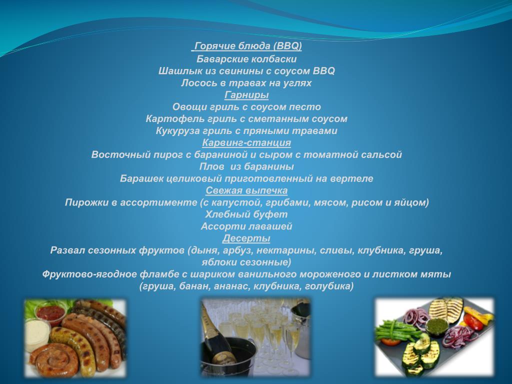 Горячие блюда (BBQ) Баварские колбаски Шашлык из свинины с соусом BBQ Лосось в травах на углях Гарниры Овощи гриль с соусом песто Картофель гриль с сметанным соусом Кукуруза гриль с пряными травами Карвинг-станция Восточный пирог с бараниной и сыром с томатной сальсой Плов из баранины Барашек целиковый приготовленный на вертеле Свежая выпечка Пирожки в ассортименте (с капустой, грибами, мясом, рисом и яйцом) Хлебный буфет Ассорти лавашей Десерты Развал сезонных фруктов (дыня, арбуз, нектарины, сливы, клубника, груша, яблоки сезонные) Фруктово-ягодное фламбе с шариком ванильного мороженого и листком мяты (груша, банан, ананас, клубника, голубика)
