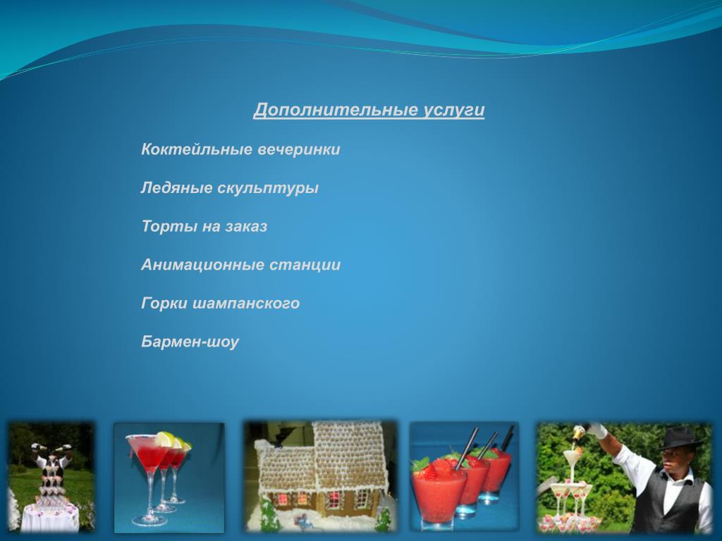Дополнительные услуги Коктейльные вечеринки Ледяные скульптуры Торты на заказ Анимационные станции Горки шампанского Бармен-шоу