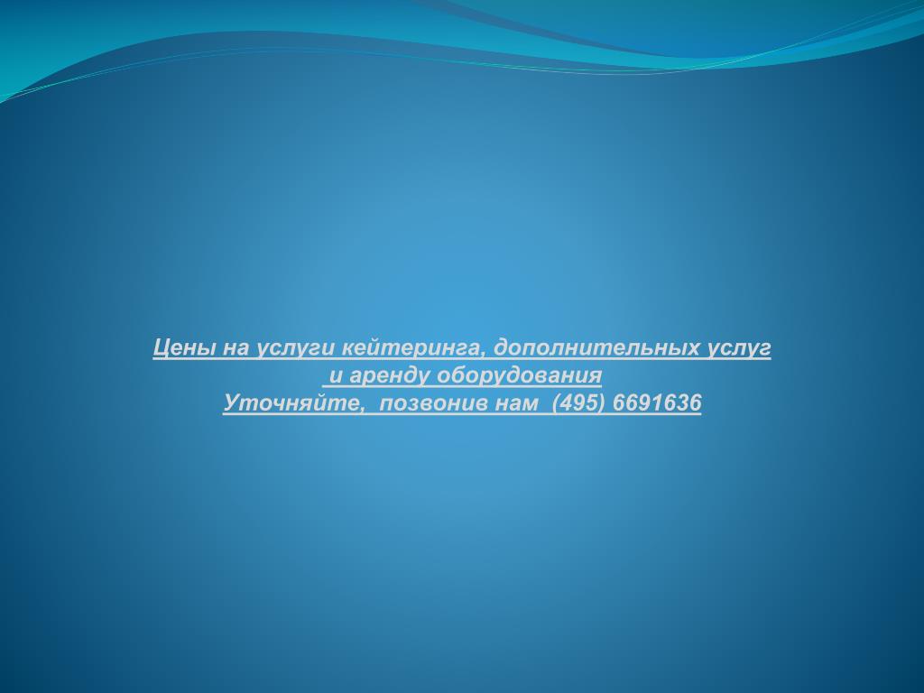 Цены на услуги кейтеринга, дополнительных услуг и аренду оборудования Уточняйте, позвонив нам (495) 6691636