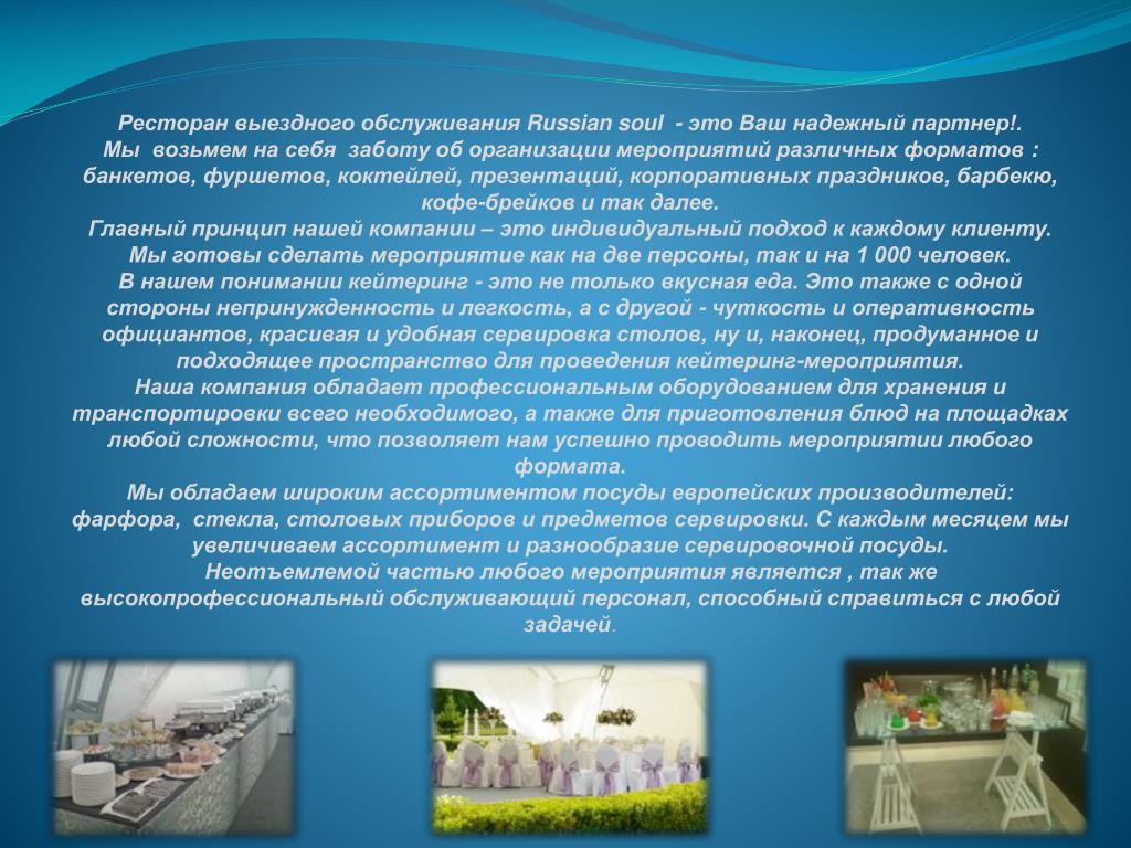 Ресторан выездного обслуживания Russian soul - это Ваш надежный партнер!. Мы возьмем на себя заботу об организации мероприятий различных форматов : банкетов, фуршетов, коктейлей,презентаций, корпоративных праздников, барбекю, кофе-брейков и так далее. Главный принцип нашей компании – это индивидуальный подход к каждому клиенту. Мы готовы сделать мероприятие как на две персоны, так и на 1 000 человек. В нашем понимании кейтеринг - это не только вкусная еда. Это также с одной стороны непринужденность и легкость, а с другой - чуткость и оперативность официантов, красивая и удобная сервировка столов, ну и, наконец, продуманное и подходящее пространство для проведения кейтеринг-мероприятия. Наша компания обладает профессиональным оборудованием для хранения и транспортировки всего необходимого, а также для приготовления блюд на площадках любой сложности, что позволяет нам успешно проводить мероприятии любого формата. Мы обладаем широким ассортиментом посуды европейских производителей: фарфора, стекла, столовых приборов и предметов сервировки. С каждым месяцем мы увеличиваем ассортимент и разнообразие сервировочной посуды. Неотъемлемой частью любого мероприятия является , так же высокопрофессиональный обслуживающий персонал, способный справиться с любой задачей.