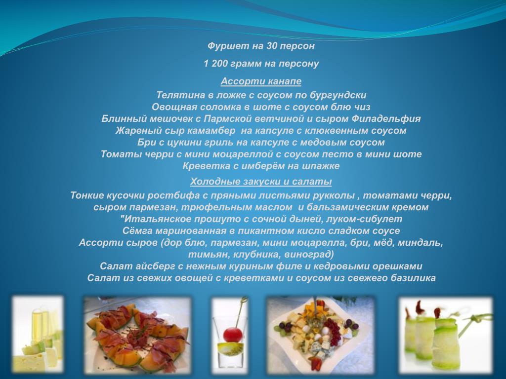 Фуршет на 30 персон 1 200 грамм на персону Ассорти канапе Телятина в ложке с соусом по бургундски Овощная соломка в шоте с соусом блючиз Блинный мешочек с Пармской ветчиной и сыром Филадельфия Жареный сыр камамбер на капсуле с клюквенным соусом Бри с цукини гриль на капсуле с медовым соусом Томаты черри с мини моцареллой с соусом песто в мини шоте Креветка с имберём на шпажке Холодные закуски и салаты Тонкие кусочки ростбифа с пряными листьями рукколы , томатами черри, сыром пармезан, трюфельным маслом и бальзамическим кремом "Итальянское прошуто с сочной дыней, луком-сибулет Сёмга маринованная в пикантном кисло сладком соусе Ассорти сыров (дор блю, пармезан, мини моцарелла, бри, мёд, миндаль, тимьян, клубника, виноград) Салат айсберг с нежным куриным филе и кедровыми орешками Салат из свежих овощей с креветками и соусом из свежего базилика