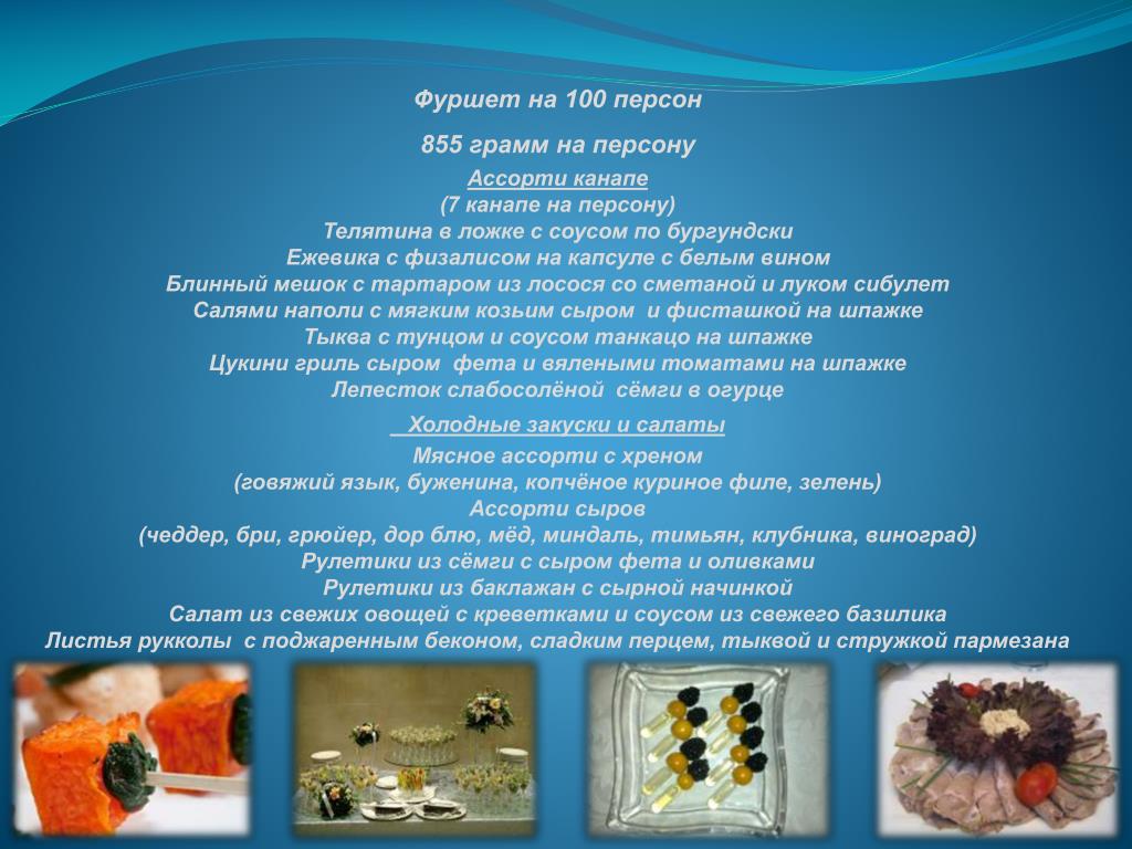 Фуршет на 100 персон 855 грамм на персону Ассорти канапе (7 канапе на персону) Телятина в ложке с соусом по бургундски Ежевика с физалисом на капсуле с белым вином Блинный мешок с тартаром из лосося со сметаной и луком сибулет Салями наполи с мягким козьим сыром и фисташкой на шпажке Тыква с тунцом и соусом танкацо на шпажке Цукини гриль сыром фета и вялеными томатами на шпажке Лепесток слабосолёной сёмги в огурце Холодные закуски и салаты Мясное ассорти с хреном (говяжий язык, буженина, копчёное куриное филе, зелень) Ассорти сыров (чеддер, бри, грюйер, дор блю, мёд, миндаль, тимьян, клубника, виноград) Рулетики из сёмги с сыром фета и оливками Рулетики из баклажан с сырной начинкой Салат из свежих овощей с креветками и соусом из свежего базилика Листья рукколы с поджаренным беконом, сладким перцем, тыквой и стружкой пармезана