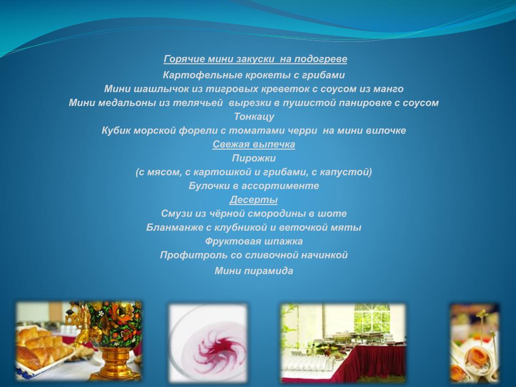 Горячие мини закуски на подогреве Картофельные крокеты с грибами Мини шашлычок из тигровых креветок с соусом из манго Мини медальоны из телячьей вырезки в пушистой панировке с соусом Тонкацу Кубик морской форели с томатами черри на мини вилочке Свежая выпечка Пирожки (с мясом, с картошкой и грибами, с капустой) Булочки в ассортименте Десерты Смузи из чёрной смородины в шоте Бланманже с клубникой и веточкой мяты Фруктовая шпажка Профитроль со сливочной начинкой Мини пирамида