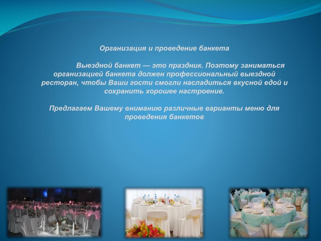Организация и проведение банкета Выездной банкет — это праздник. Поэтому заниматься организацией банкета должен профессиональный выездной ресторан, чтобы Ваши гости смогли насладиться вкусной едой и сохранить хорошее настроение. Предлагаем Вашему вниманию различные варианты меню для проведения банкетов