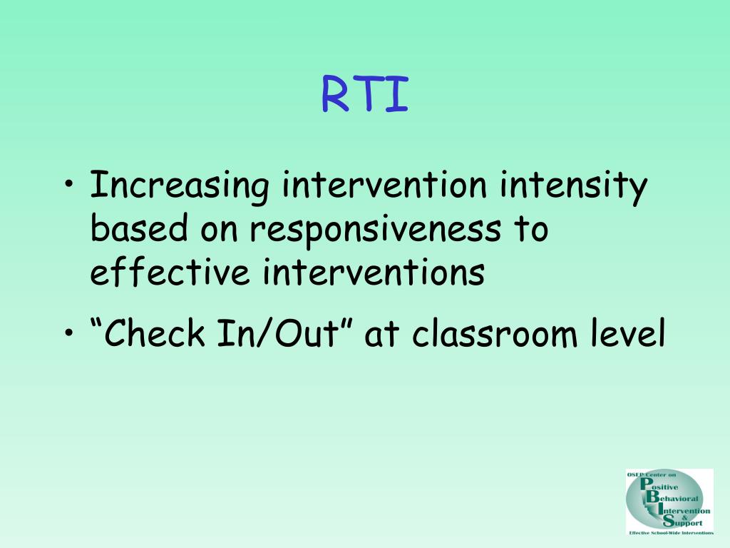 RTI • Increasing intervention intensity based on responsiveness to effective interventions • “Check In/Out” at classroom level