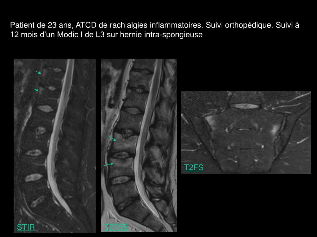 Patient de 23 ans, ATCD de rachialgies inflammatoires. Suivi orthopédique. Suivi à 12 mois d’un Modic I de L3 sur hernie intra-spongieuse T2FS T2TSE STIR