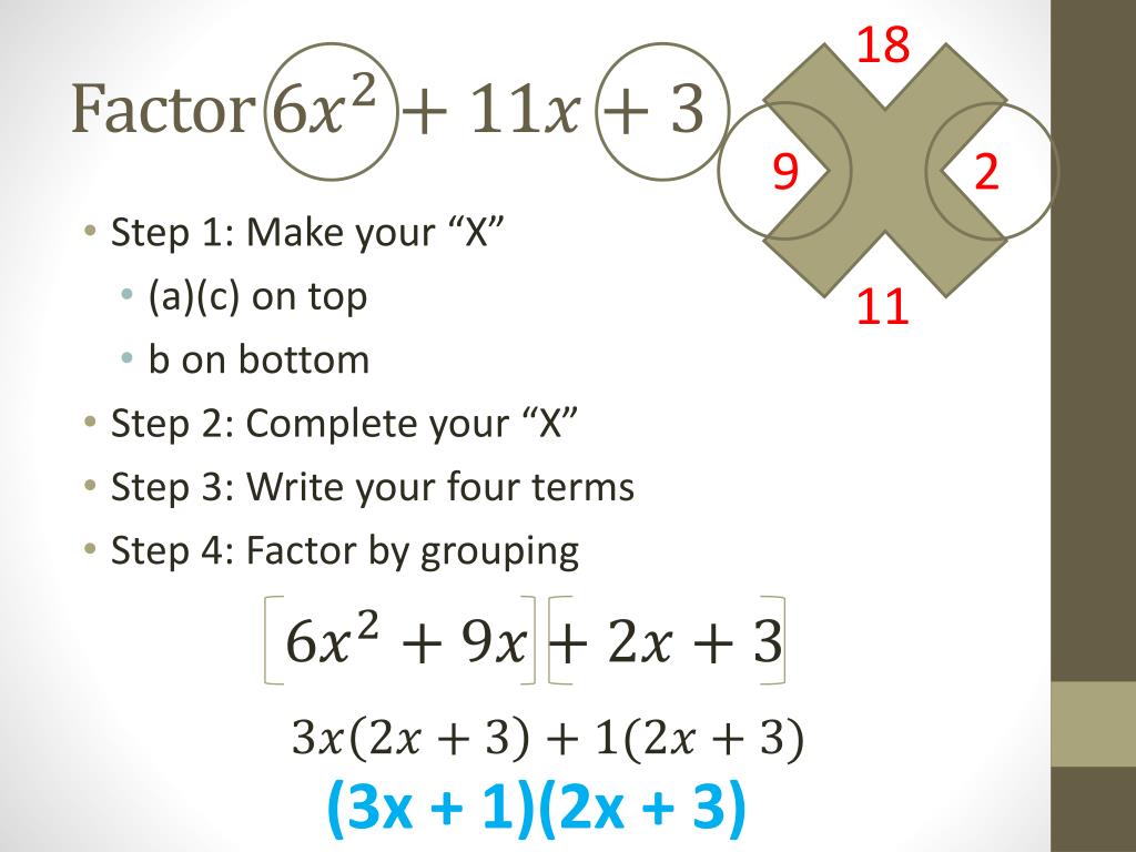 2.2 Factoring Tricky Trinomials. 18. Factor . 9. 2. Step 1: Make your “X” (a)(c) on top b on bottom Step 2: Complete your “X” Step 3: Write your four terms Step 4: Factor by grouping. 11. (3x + 1)(2x + 3). Let’s try another together. What should we do if a is negative?. Assignment.