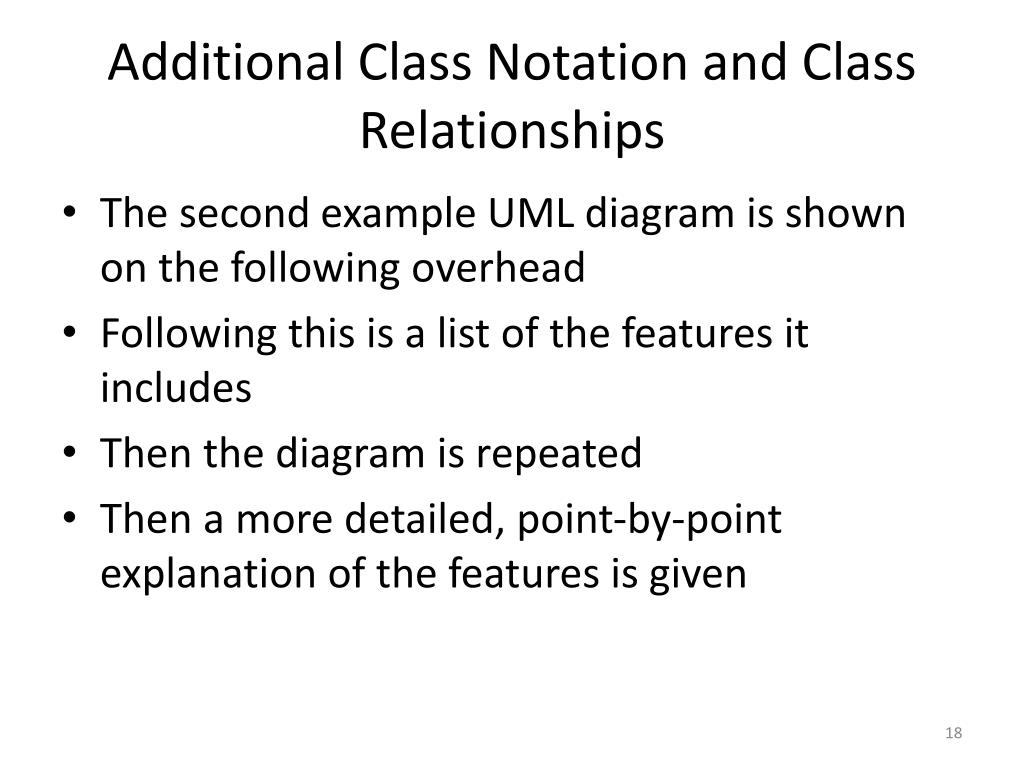 Additional Class Notation and Class Relationships • The second example UML diagram is shown on the following overhead • Following this is a list of the features it includes • Then the diagram is repeated • Then a more detailed, point-by-point explanation of the features is given