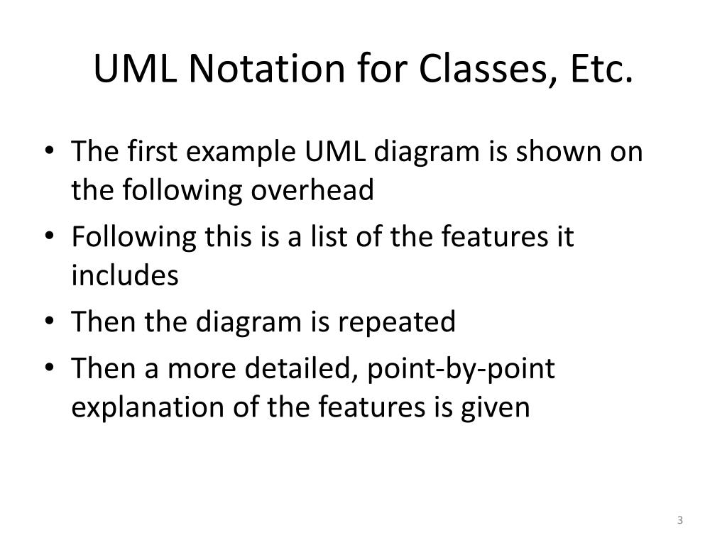 UML Notation for Classes, Etc. • The first example UML diagram is shown on the following overhead • Following this is a list of the features it includes • Then the diagram is repeated • Thena more detailed, point-by-point explanation of the features is given