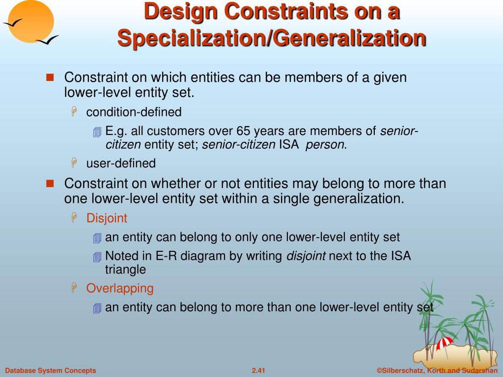 Design Constraints on a Specialization/Generalization • Constraint on which entities can be members of a given lower-level entity set. • condition-defined • E.g. all customers over 65 years are members of senior-citizen entity set; senior-citizen ISA person. • user-defined • Constraint on whether or not entities may belong to more than one lower-level entity set within a single generalization. • Disjoint • an entity can belong to only one lower-level entity set • Noted in E-R diagram by writing disjoint next to the ISA triangle • Overlapping • an entity can belong to more than one lower-level entity set