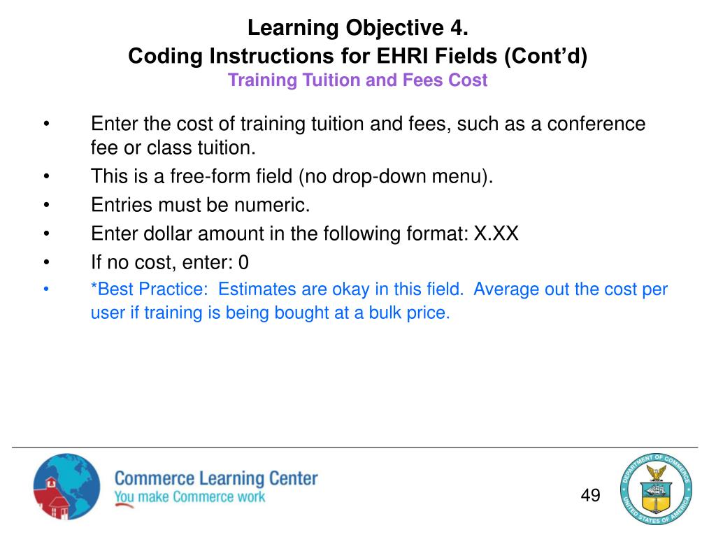Learning Objective 4.Coding Instructions for EHRI Fields (Cont’d)Training Materials Cost • Enter the cost to the Government for any training materials used by the student (not included in the tuition cost). • Examples include: • Cost of supplies • Cost of equipment • Cost of software • This is a free-form field (no drop-down menu). • Entries must be numeric. • Enter data in the following format: X.XX • If no cost, enter: 0 48