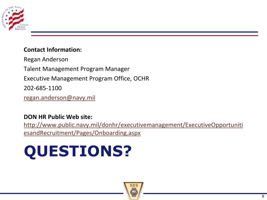 Contact Information: Regan Anderson Talent Management Program Manager Executive Management Program Office, OCHR 202-685-1100 regan.anderson@navy.mil DON HR Public Web site: http://www.public.navy.mil/donhr/executivemanagement/ExecutiveOpportunitiesandRecruitment/Pages/Onboarding.aspx Questions?