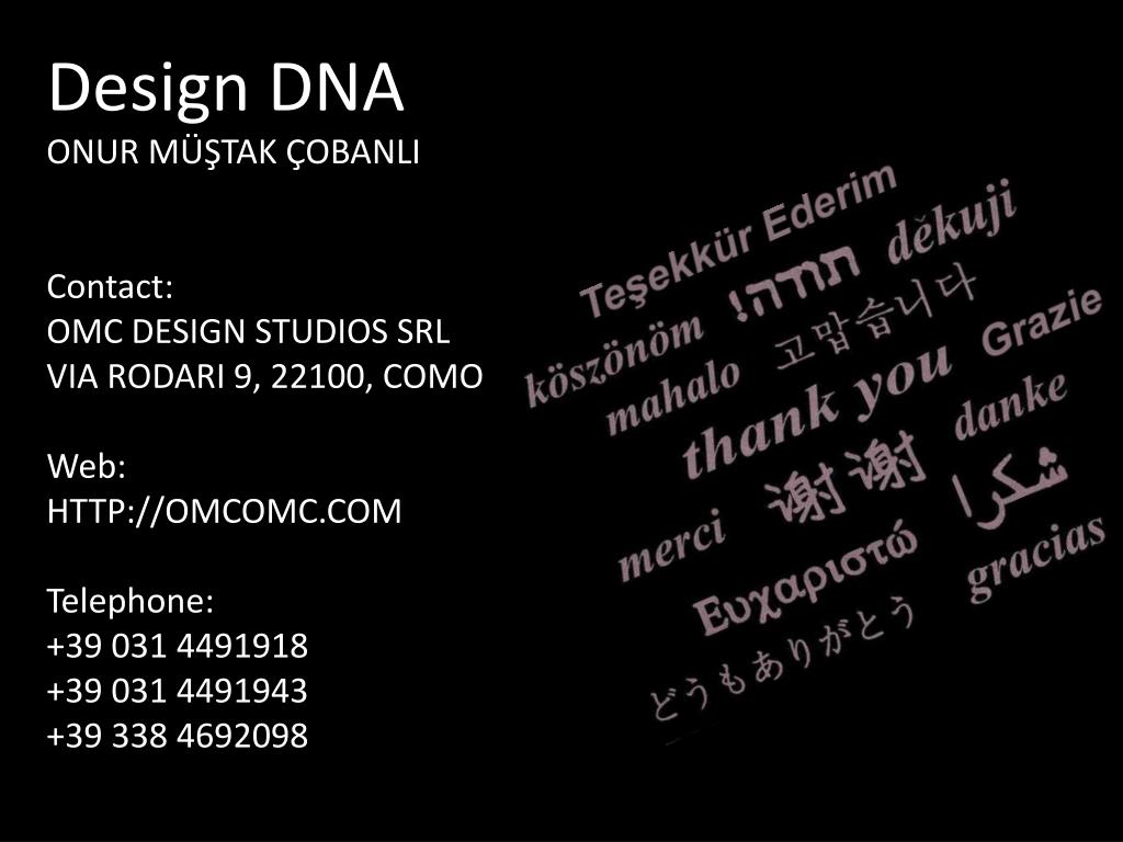 Design DNA ONUR MÜŞTAK ÇOBANLIContact: OMC DESIGN STUDIOS SRLVIA RODARI 9, 22100, COMOWeb:HTTP://OMCOMC.COMTelephone:+39 031 4491918+39 031 4491943+39 338 4692098