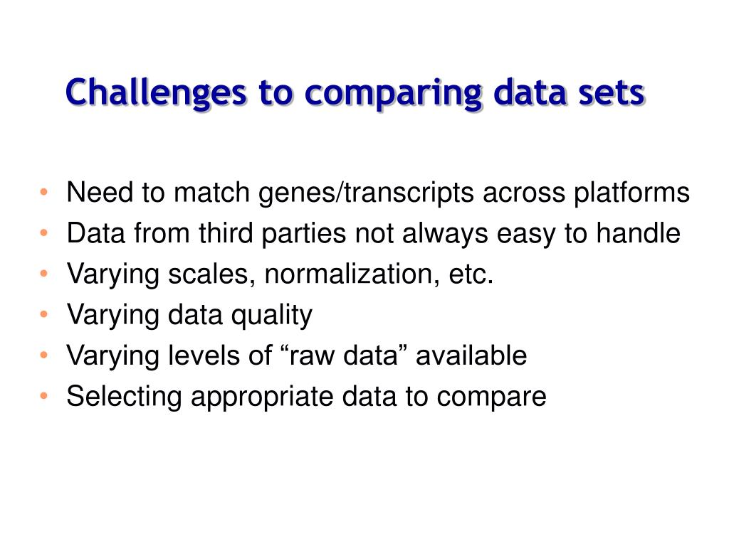 Challenges to comparing data sets • Need to match genes/transcripts across platforms • Data from third parties not always easy to handle • Varying scales, normalization, etc. • Varying data quality • Varying levels of “raw data” available • Selecting appropriate data to compare