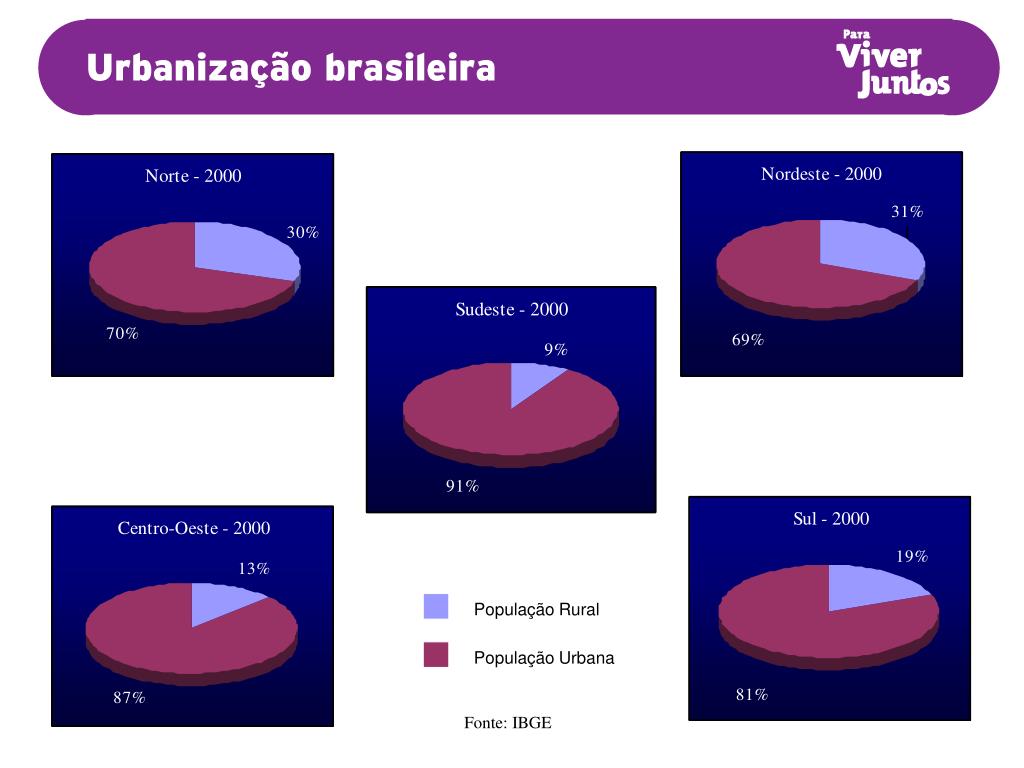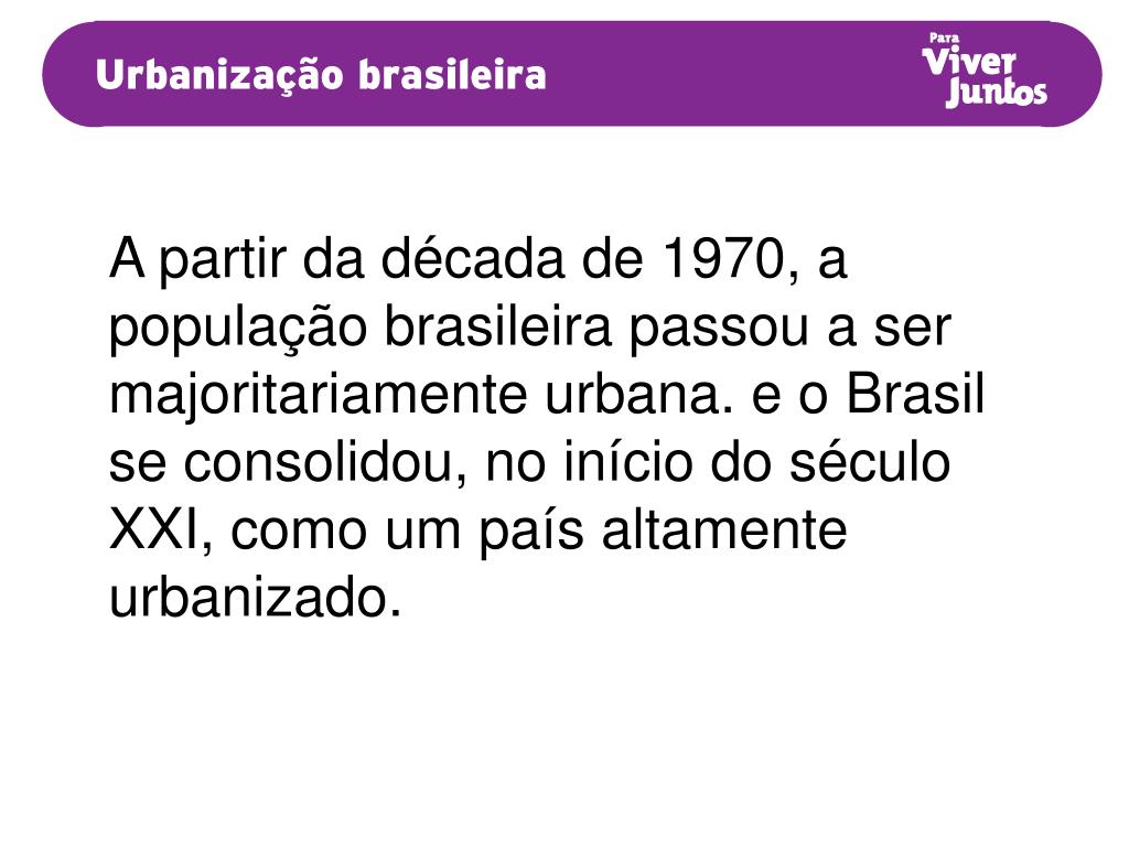 A partir da década de 1970, a população brasileira passou a ser majoritariamente urbana. e o Brasil se consolidou, no início do século XXI, como um país altamente urbanizado.