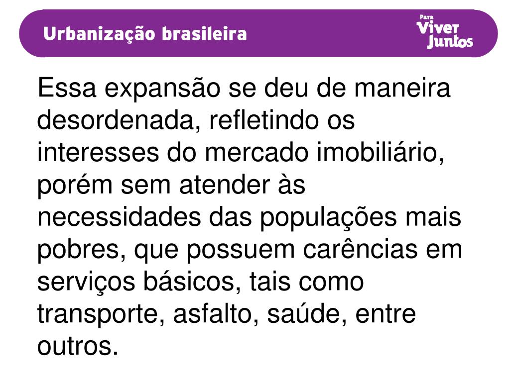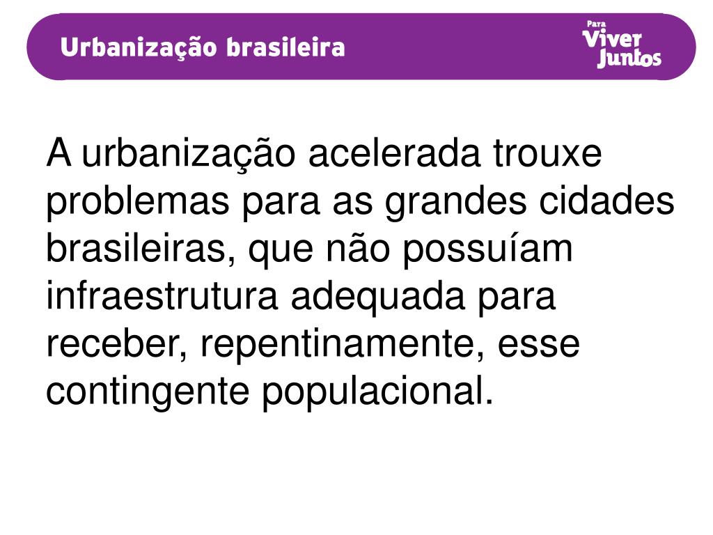 A urbanização acelerada trouxe problemas para as grandes cidades brasileiras, que não possuíam infraestrutura adequada para receber, repentinamente, esse contingente populacional.